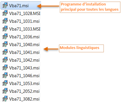 - Vba71.msi est le programme d'installation principal pour toutes les langues. Les autres programmes d'installation sont des modules linguistiques. Pour identifier le module linguistique approprié pour votre langue, reportez-vous à la page :https://msdn.microsoft.com/en-us/library/ms912047(v=winembedded.10).aspx. Le cas échéant, cliquez avec le bouton droit de la souris sur le programme d'installation, puis choisissez Installer.
