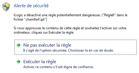 Une alerte de sécurité s'affiche lorsque vous exécutez une règle considérée comme étant potentiellement dangereuse par Inventor. Vous pouvez choisir d'exécuter la règle comme si elle était fiable, ou ne rien faire.