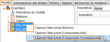 - Dans le fichier ensemble, dans la boîte de dialogue Modifier la règle de l'onglet Modèle, sélectionnez les noms des composants, cliquez avec le bouton droit de la souris, puis choisissez Capture.Current.State (Components Constraints.Add) dans le menu contextuel.