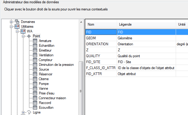 Exemple : dans l'application Eau, la classe d'objets de service des noeuds possède une relation multiple à toutes les classes d'objets d'attribut de point, comme l'armature, l'émetteur, la ventilation, les compteurs, etc. La classe d'objets de service des arêtes est associée à la classe d'objets attribut de ligne Canalisation.