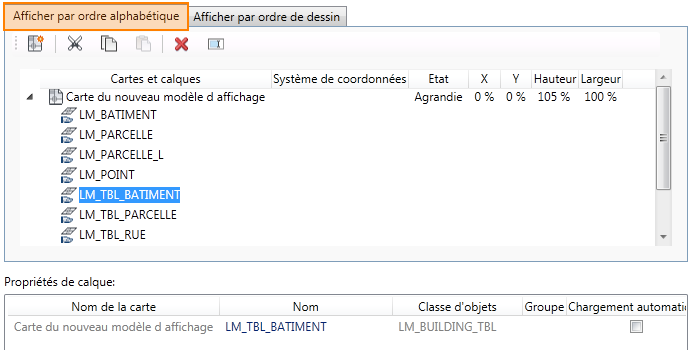 Cliquez sur l'onglet Vue par ordre alphabétique pour voir les cartes de modèle d'affichage et les calques d'objets dans l'ordre alphabétique. Modifiez les éléments, comme indiqué dans le tableau ci-dessous.