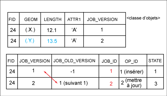 Si un utilisateur traite un objet au sein d'une tâche donnée (JOB_ID) et, par exemple, modifie un objet, l'opération est enregistrée dans la table TB_JOB_VERSION comme suit :