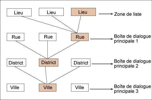 Voici les relations qui existent : il y a plusieurs villes ayant chacune plusieurs districts, ayant chacun plusieurs rues, elles-mêmes ayant plusieurs situations géographiques (numéro de rue).
