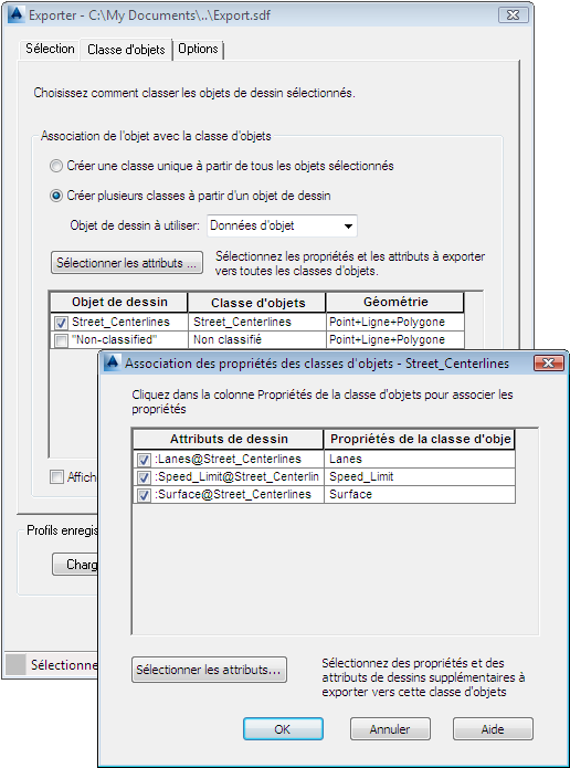 Lors de l'exportation d'objets de dessin, vous pouvez utiliser des données d'objets pour créer des classes d'objets dans un fichier SDF. Ces classes d'objets sont dotées de propriétés qui correspondent aux attributs de données d'objets.