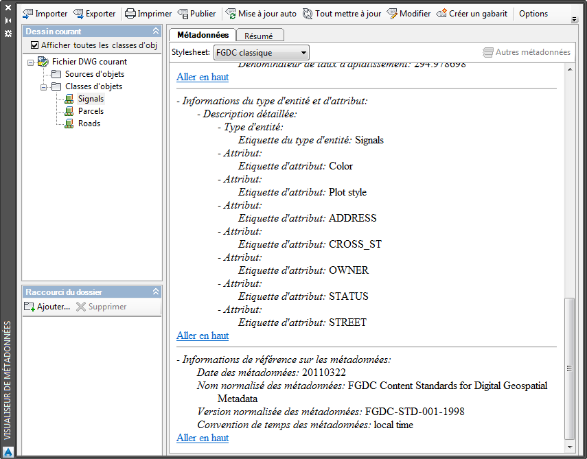 Si un dessin contient des objets classifiés, ses métadonnées sont automatiquement générées et affichées lorsque vous ouvrez le visualiseur de métadonnées pour la première fois.