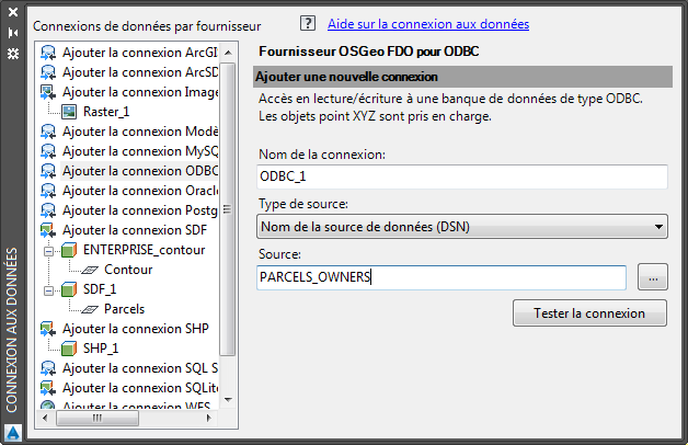 Dans la fenêtre Connexion aux données, spécifiez la nouvelle connexion. N'ajoutez pas à la carte de calque de classe d'objets spécifique à partir de la source ODBC. AutoCAD Map 3D toolset dispose automatiquement de toutes les informations nécessaires lors de la connexion à la source ODBC.