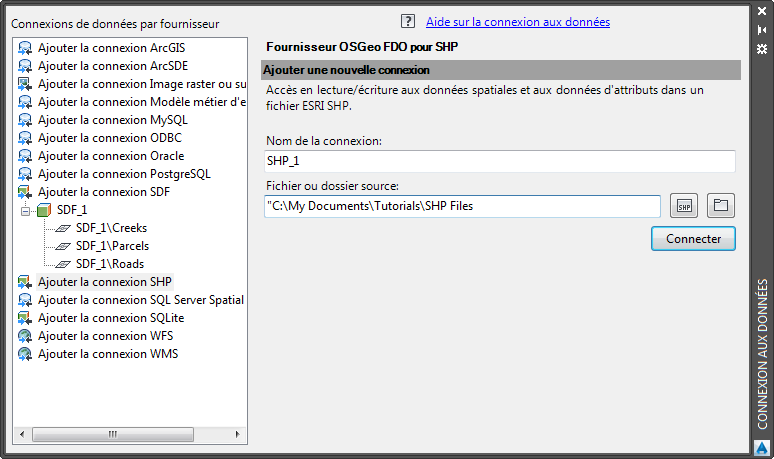 Vous allez créer un nouveau dossier vide dans lequel vous placerez les fichiers SHP. Pour convertir et copier des données au format SHP, vous devez être connecté à ce dossier. Utilisez Connexion aux données pour établir des connexions avec les banques de données, même si vous n'ajoutez aucune donnée de la banque de données à la carte.