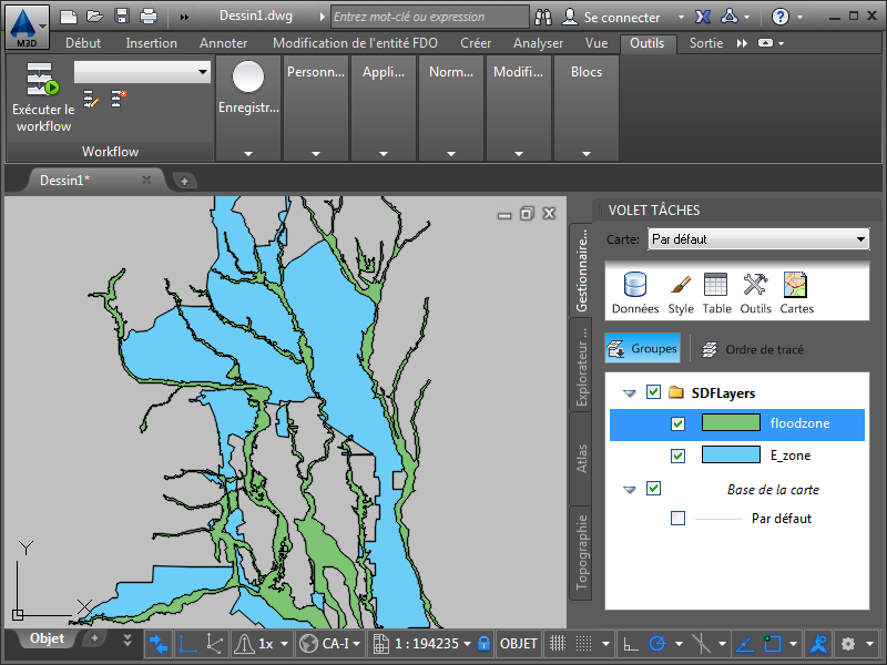 Lorsque vous exécutez le workflow, AutoCAD Map 3D toolset affiche la liste des fichiers SDF dans le dossier désigné. Il crée un groupe du Gestionnaire d'affichage pour les calques qu'il crée. Il se connecte aux fichiers SDF du dossier désigné. Pour chaque dessin du dossier indiqué, elle se connecte, ajoute un calque au Gestionnaire d'affichage et déplace les calques dans le nouveau groupe.