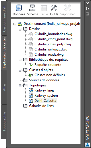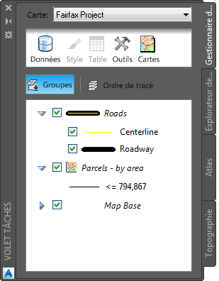 Le volet Tâches permet d'accéder rapidement aux objets fréquemment utilisés et de les regrouper dans des vues associées aux tâches. Le volet Tâches vous permet de créer, de gérer, d'afficher et de publier des cartes.