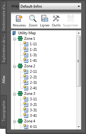 Utilisez l'onglet Atlas pour créer des cartes imprimées, des atlas et des fichiers DWF de plusieurs pages à partir de cartes stylisées. L'atlas utilise le gestionnaire du jeu de feuilles d'AutoCAD et affiche une arborescence des tuiles de l'atlas, comparable aux pages d'un atlas. Utilisez les flèches de navigation pour passer d'une tuile à l'autre dans votre carte.