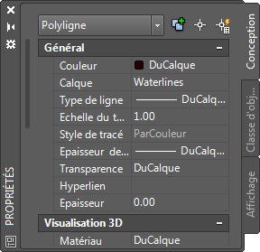 Les routes sont des objets d'un dessin AutoCAD. Notez que la sélection courante est définie comme une polyligne. Pour les objets de dessin, vous pouvez mettre en forme certaines propriétés avec la palette Propriétés.