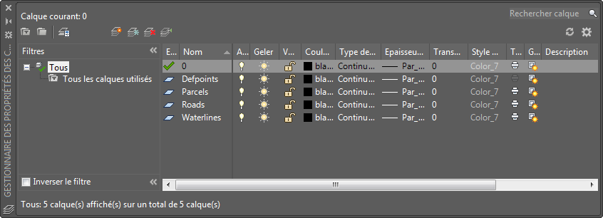 Les calques du dessin sont répertoriés avec leurs propriétés.