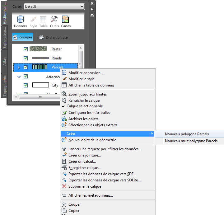 Chaque élément d'AutoCAD Map 3D toolset est associé à un menu personnalisé contenant des commandes disponibles pour cet élément à un moment donné.