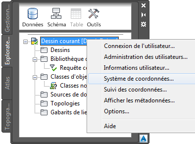 - Cliquez avec le bouton droit de la souris sur le dessin courant, puis choisissez Système de coordonnées.