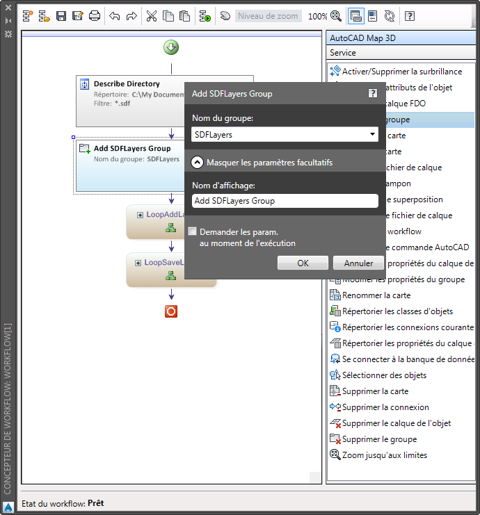Dans cette leçon, vous allez modifier le workflow prédéfini qui crée des calques du Gestionnaire d'affichage à partir d'un dossier contenant des fichiers SDF et les enregistre dans des fichiers .layer. Vous allez créer un groupe et y déplacer les calques.