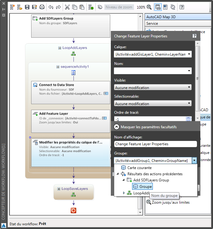 Etant donné que vous voulez changer la propriété Groupe de chaque calque que vous ajoutez, placez cette activité à l'intérieur de l'activité ForEach appelée "LoopAddLayers".