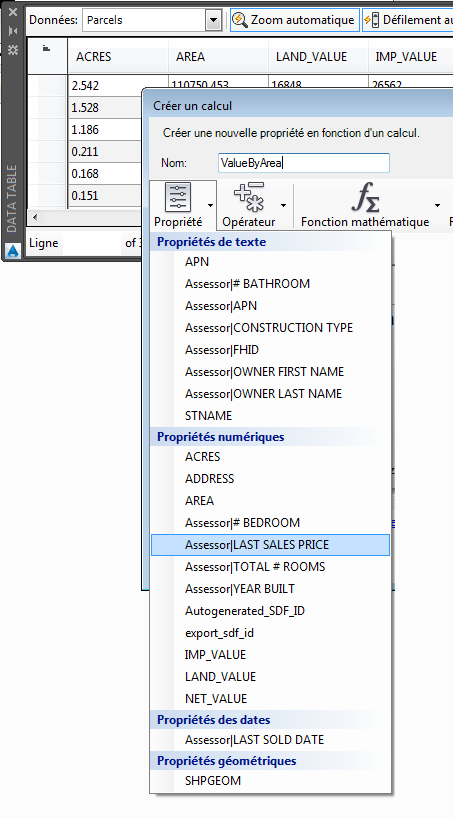 Vous avez joint les données des propriétaires au calque Parcels et enregistré les résultats dans une nouvelle banque de données. Vous pouvez utiliser les informations combinées pour créer une propriété calculée. Celle-ci est le résultat d'une expression, dans ce cas, le dernier prix de vente divisé par la superficie.