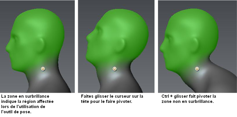 L'outil Pose fait pivoter, déplace ou met à l'échelle les zones d'un modèle associées à une jonction. Toute zone qui affiche une couleur de pondération lorsque la jonction est sélectionnée sera affectée. La saturation de la couleur verte de la région pondérée indique l'ampleur de l'incidence de la jonction. Vous pouvez modifier la zone d'influence d'une jonction à l'aide de l'outil Poids de jonction (reportez-vous à la rubrique Ajustement de la zone d'influence d'une jonction).