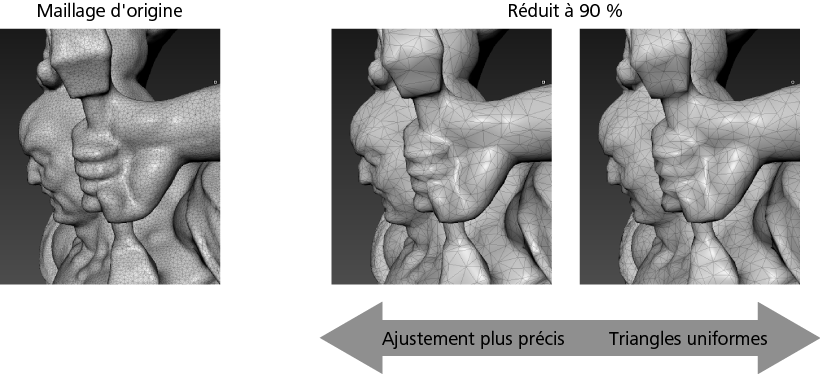 Ajustez cette valeur afin d'indiquer l'effet le plus important souhaité dans les maillages générés : Ajustement plus précis ou Triangles uniformes.