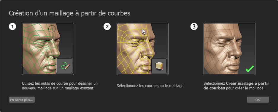 Cette fenêtre s'affiche lorsque vous cliquez sur Aide dans la fenêtre Créer maillage à partir de courbes ou si Mudbox détecte certains types de problèmes lors de la création d'un maillage à partir de courbes.