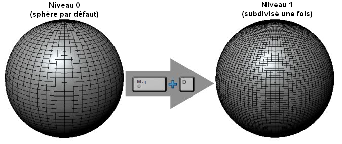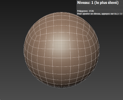 La sphère présente deux niveaux de subdivision : 0 et 1. Le niveau de subdivision actif est 1.