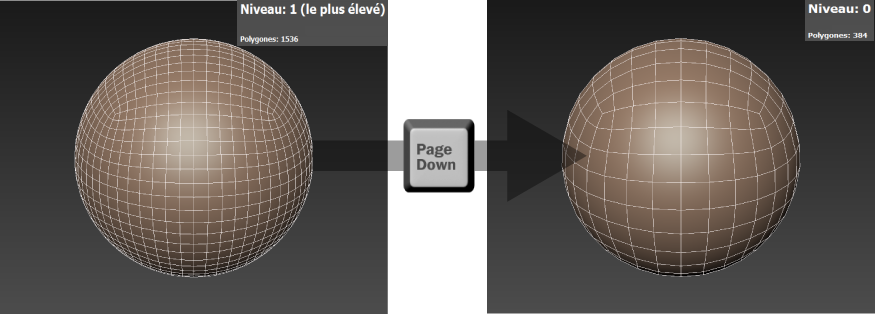 | Remonter d'un niveau de subdivision | Page précédente | Affiche le niveau suivant le plus dense sur le modèle sélectionné. |