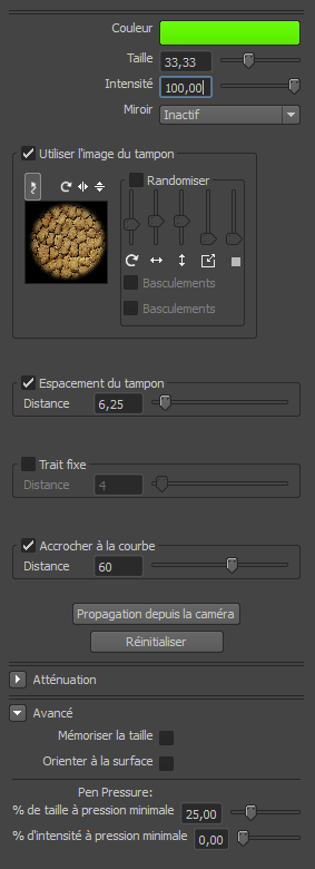 Vous pouvez modifier rapidement l'atténuation du pinceau en sélectionnant un préréglage d'atténuation dans la barre d'outils Atténuation ou en modifiant la forme du graphique d'atténuation dans la section Atténuation des propriétés du pinceau.