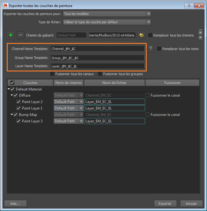 Définition des chemins d'exportation pour les couches, les groupes et les canaux de peinture