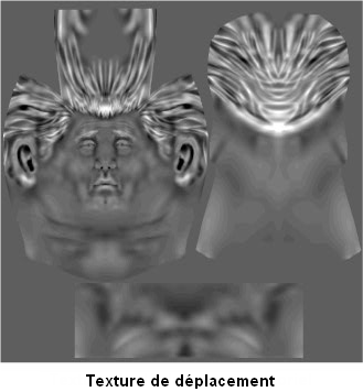 Une texture de déplacement est une image 2D qui enregistre les informations de hauteur pour les points du modèle sous forme d'échelle de gris. Les textures de déplacement permettent à un modèle de représenter des détails visuels non modélisés ou sculptés dans le maillage d'origine et peuvent être utilisées en tant que méthode de transfert des détails de sculpture d'un modèle à un autre.