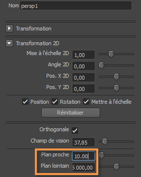 Si vous modifiez les attributs de la caméra tels que Plan de délimitation proche et Plan de délimitation éloigné dans Maya, les attributs de Mudbox correspondants (Plan proche et Plan lointain) sont mis à jour avec les mêmes valeurs.