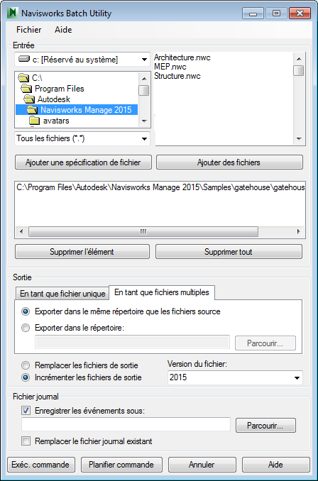 Batch Utility Vous pouvez également cliquer sur le bouton Ajouter un fichier de spécification. Autodesk Navisworks convertit alors les fichiers se trouvant dans le dossier sélectionné. L'option choisie dans le menu Type de fichier détermine quels fichiers sont convertis.