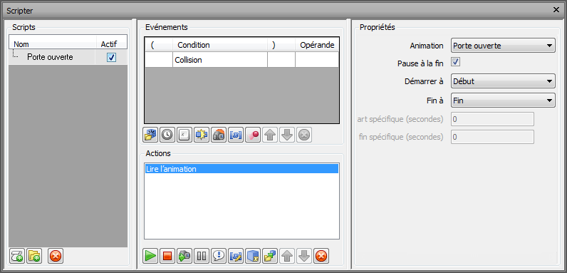 La fenêtre Scripter se compose de la vue de l'arborescence, de la vue des événements, de la vue des actions et de la vue des propriétés.