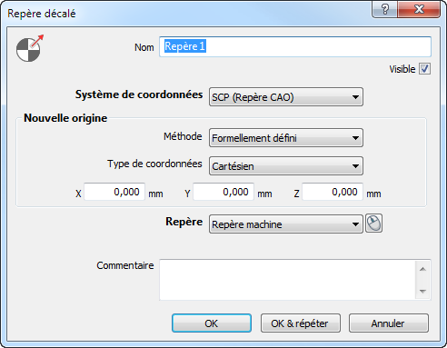 - Pour afficher le repère dans la vue CAO, cochez la case Visible.