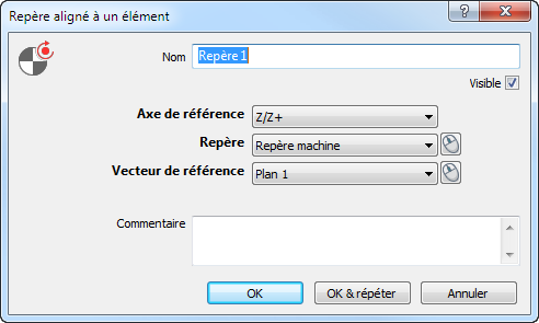 - Dans la liste Vecteur de référence, sélectionnez le vecteur avec lequel vous voulez aligner le repère.