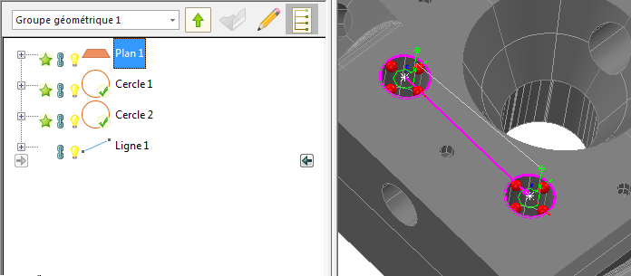 Cliquez sur Accueil > Parcours de palpeur > Visibilité > Afficher les parcours visibles, pour afficher les parcours de palpeur pour tous les éléments actuellement affichés dans la vue CAO. Par exemple :