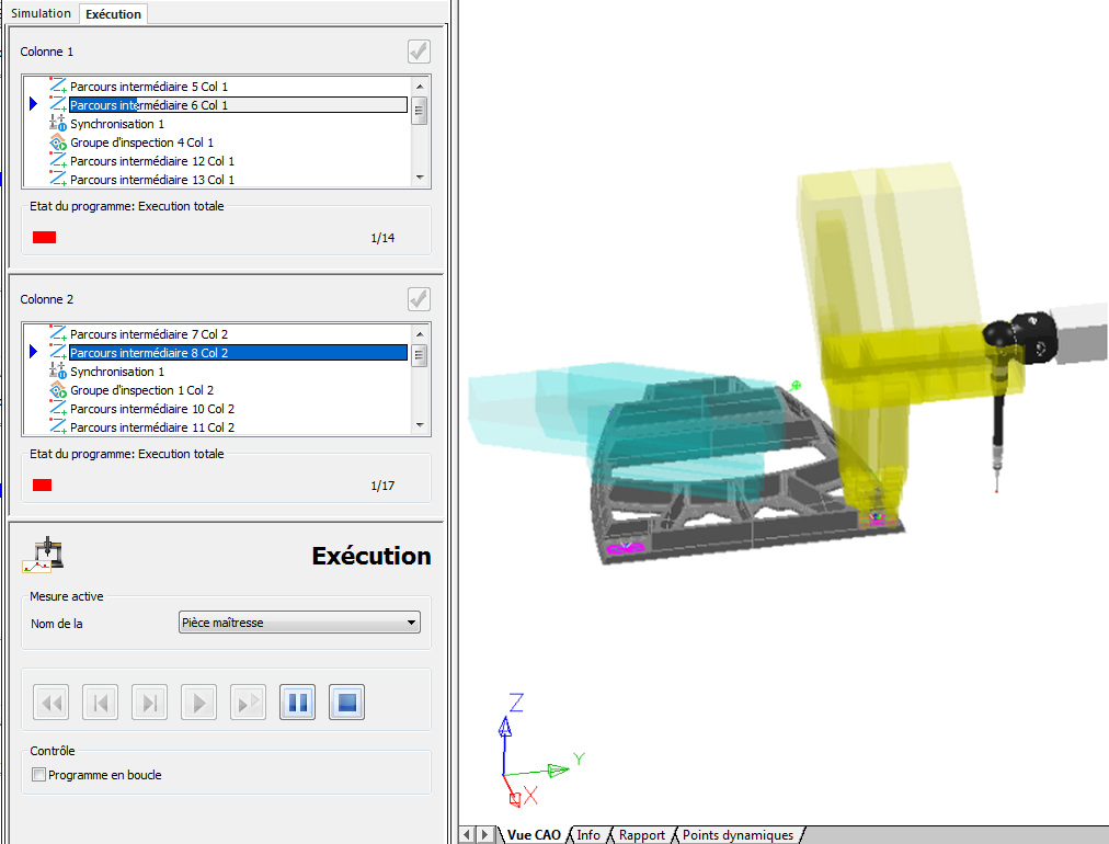 En mode double-colonne, les éléments associés à chaque colonne sont affichés en différents section de l'onglet Exécution. Cela vous permet de contrôler quelles colonnes sont exécutées, de voir la progression de l'inspection sur chaque colonne quand elles sont exécutées simultanément et de spécifier des intervalles distincts pour chaque ensemble d'éléments. Par défaut, la vue CAO affiche également les mouvements prédits de chaque colonne afin que vous puissiez vérifier leurs positions relatives et éviter les collisions potentielles.