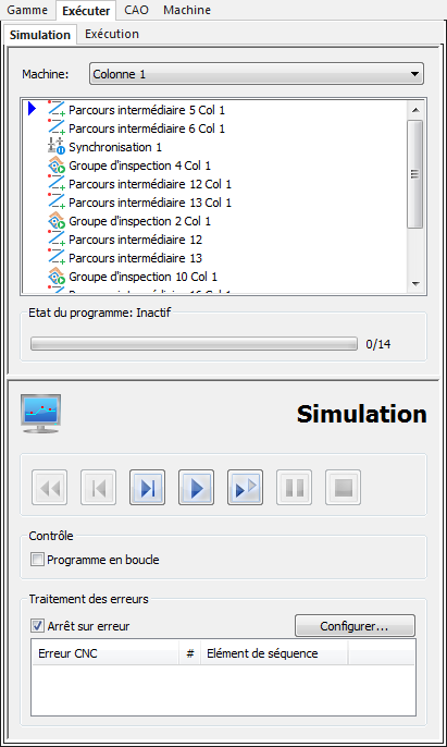 - Utilisez les boutons de la boite de dialogue Simulation pour simuler la séquence d'inspection. Par exemple, pour simuler tous les éléments affectés à la colonne sélectionnée, cliquez sur Exécuter tous les éléments