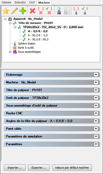 Pour afficher et gérer des fichiers la base de données de palpeur et afficher les détails de l'étalonnage pour une MMT, cliquez sur l'onglet Outils > Machines > Palpeurs. Les détails du palpeur utilisé et de ses étalonnages actuels sont affichés dans la boîte de dialogue Configuration de la machine.