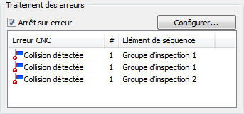 La liste Traitement des erreurs contient les erreurs identifiées par PowerInspect. Chaque entrée spécifie le type d'erreur, le nombre d'erreurs dans le mouvement et l'élément de séquence dans lequel l'erreur s'est produite. Par exemple :