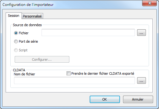 - Script pour spécifier un processus d'importation perso. Par exemple, cette option vous permet de spécifier un méthode perso pour l'importation de données depuis des sources autres que des fichiers ou des ports série.