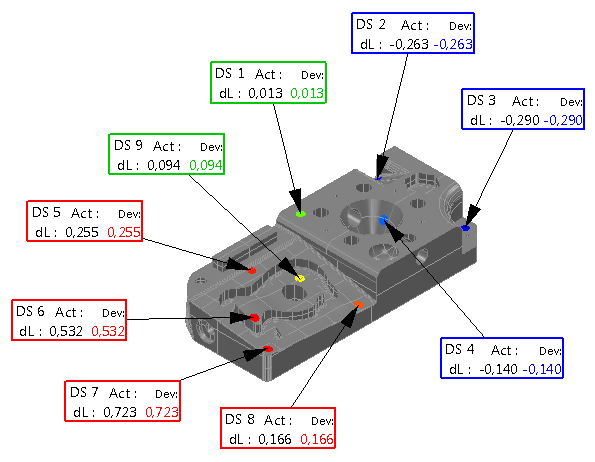 - Le noir indique que l'élément n'a pas été mesuré (par exemple, éléments construits), ou que les mesures n'ont pas été comparées avec les nominales de l'élément.