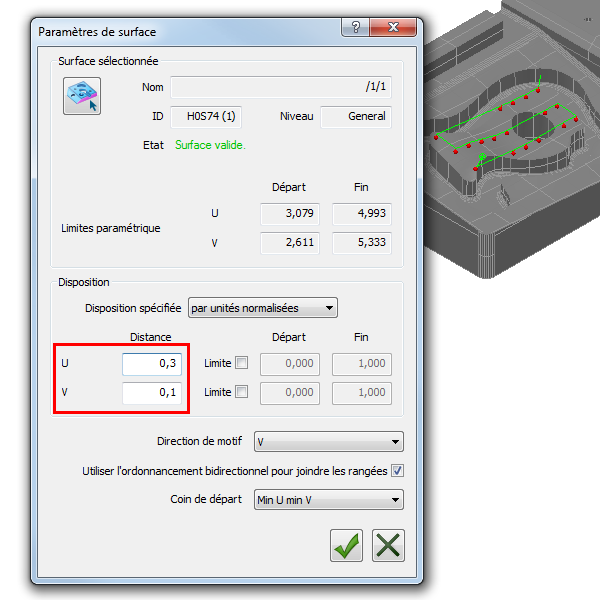 Les cases qui contrôlent les distances d'écart et de pas du parcours de palpeur dépendent des directions u et v de la surface sélectionnée. Ici, comme dans l'exemple d'unités paramétriques, la case U spécifie la distance d'écart entre les rangées et la case V spécifie la distance de pas entre les points.