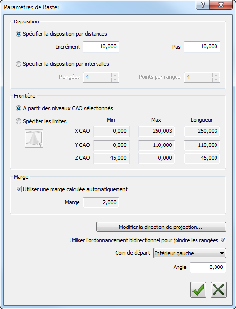 - Cochez la case Utiliser l'ordonnancement pour joindre les rangées pour alterner la direction du parcours de palpeur entre les rangées. Décochez la case pour utiliser la même direction pour chaque rangée.