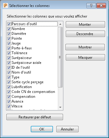 Utilisez le dialogue Sélectionner les colonnes pour personnaliser les vues de colonne. Cela vous permet de contrôler et de donner la priorité à la quantité d'informations affichée dans les dialogues Programme NC et Base de données d'outils.