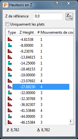 - Cliquez sur l'onglet Parcours d'outil > panneau Dessiner > Voir par hauteur Z pour afficher la boîte de dialogue Hauteurs Z. Les hauteurs Z disponibles dans le parcours d'outil sont listées dans la liste Hauteur Z.