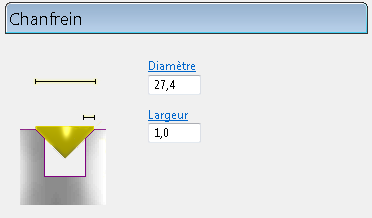 Utilisez la page Chanfrein pour créer un chanfrein sans avoir à définir le trou sous la forme d'un perçage conique.