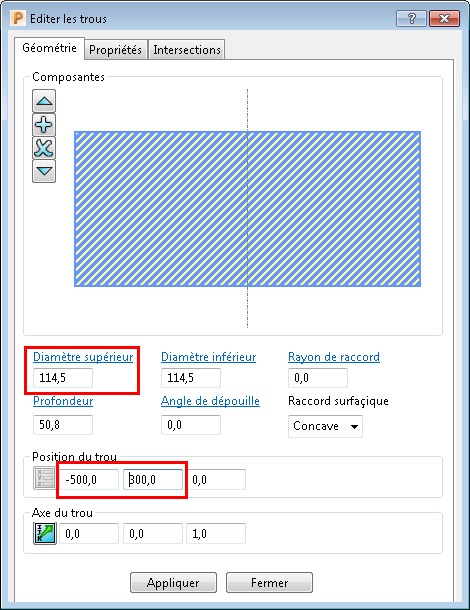 Si vous éditez un trou combiné, sélectionnez le composant approprié dans la zone graphique de la boîte de dialogue (le composant sélectionné est hachuré), puis éditez les valeurs appropriées.