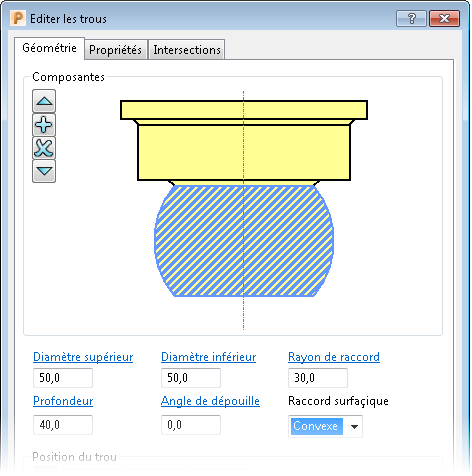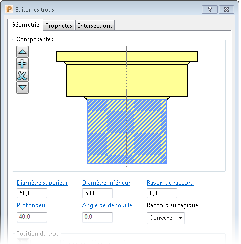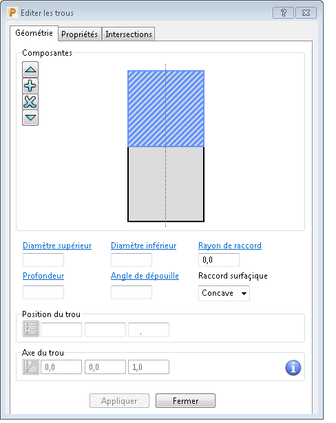 L'onglet Géométrie sur le dialogue Editer trou édite un composant de trou.