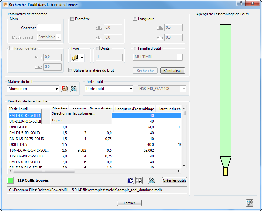 Pour copier les données des dialogues Programme CN ou Base de données d'outils, faire un clic droit sur l'en-tête de colonne et sélectionner Copier.