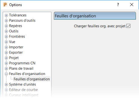 Après avoir prévisualisé les feuilles d'organisation, vous pouvez ordonner à PowerMill de les charger automatiquement dans l'onglet Navigateur à chaque fois que vous ouvrez votre projet :